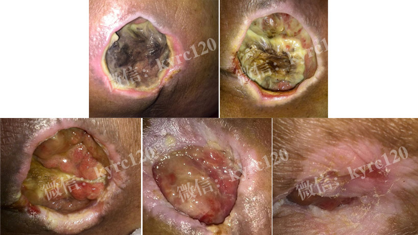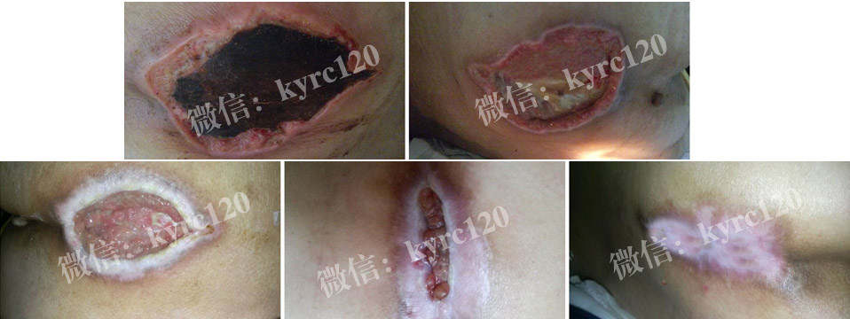 家住济南历城区的,孙女士,由于脑血管畸形破裂,瘫痪长期卧床,由于家庭负担偏重,上有老,下有小,家人疏与护理,出现尾骶部褥疮(约5X6CM)黑痂比较硬。尝试不少方法,得不到控制。与我处联系,我处专家认为患者主要是治疗操作不当导致的,黑痂型褥疮。在我处专家指导下采用煟脓祛腐生肌疗法,先软化消除黑痂,排出腐肉,让肉芽组织从内往外一步步生长,前后二十天患者比较满意。(过程如上图)!