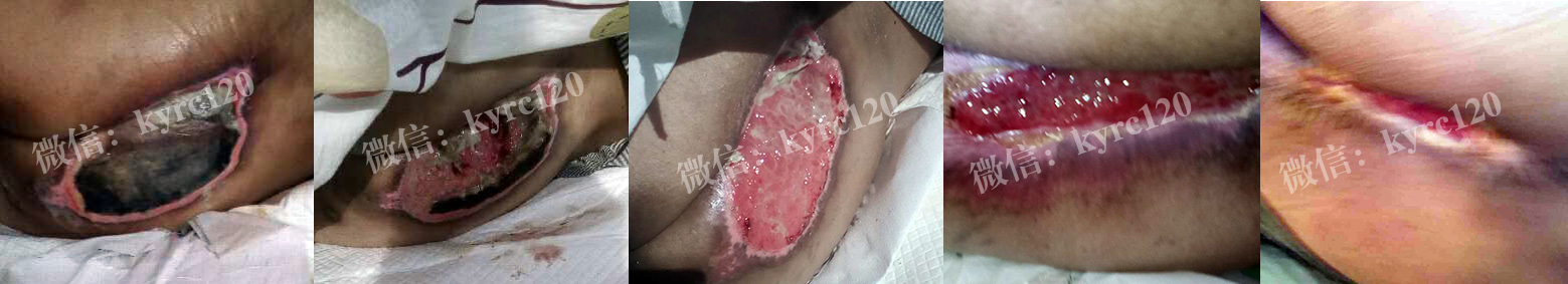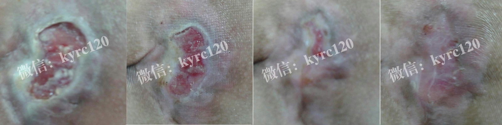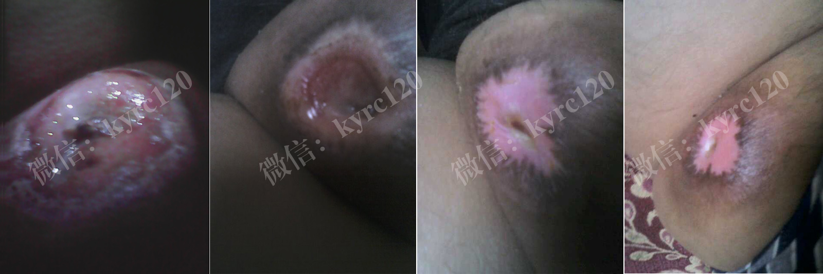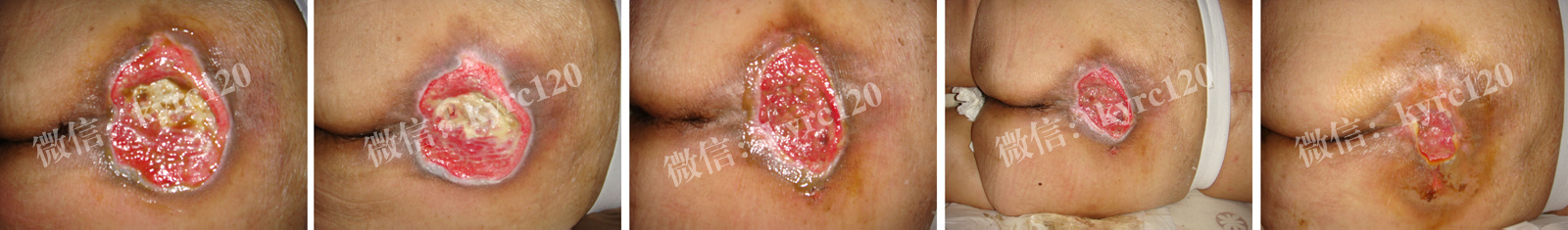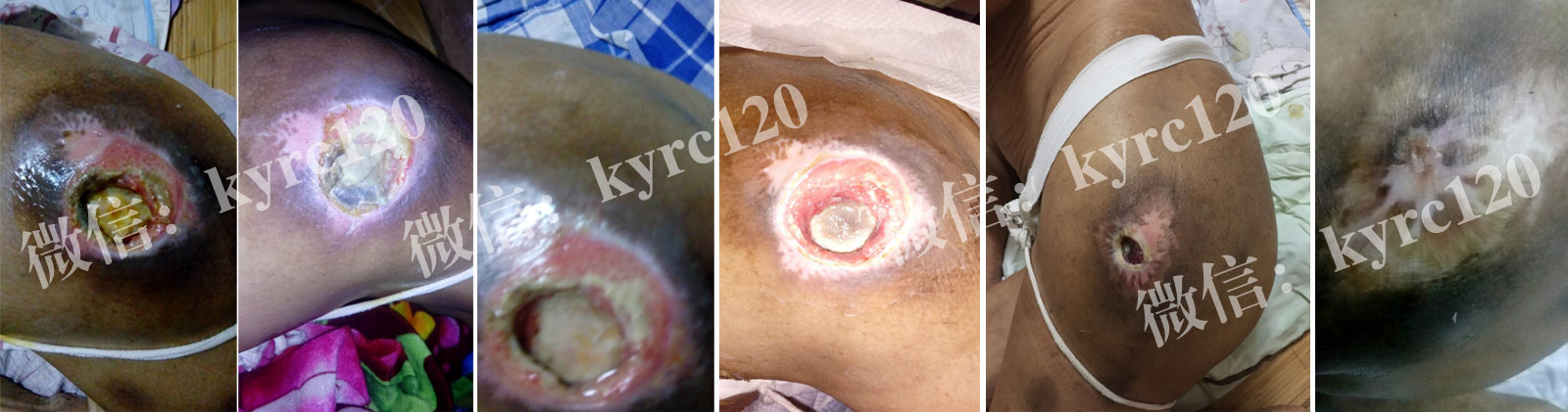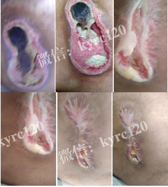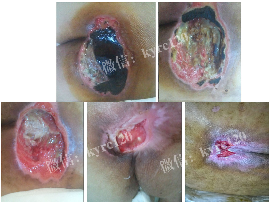 湖南衡阳的,付先生46岁,从高空坠落,造成神经损伤截瘫,造成尾骨部,大腿根部出现褥疮,创面约6x6大面积溃烂且比较深,有黄色脓液和恶臭。采用我处煟脓,祛腐,生肌方法,排出腐肉脓液,肉芽组织长出,上皮组织收口,患者及家人都很满意。(如上图)
